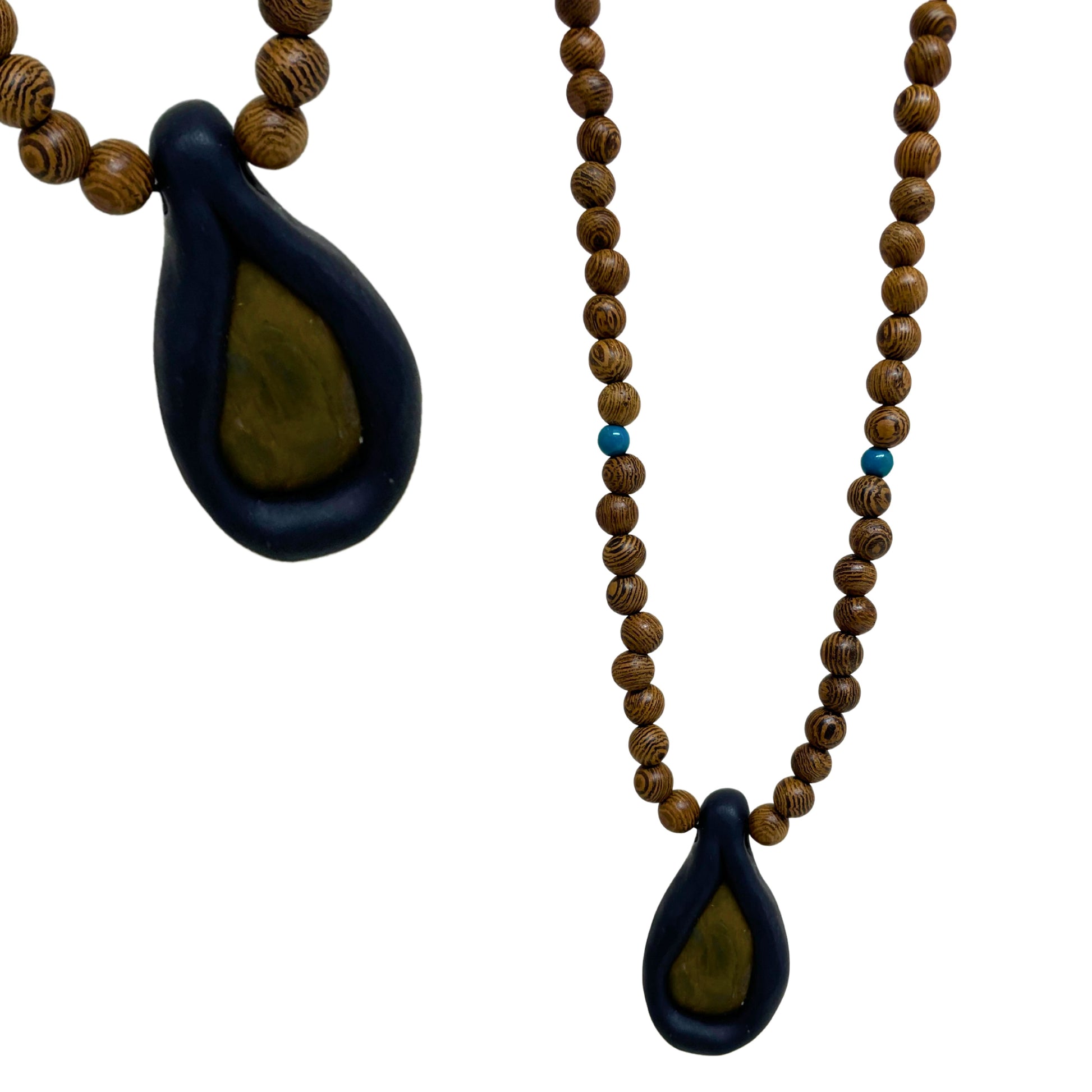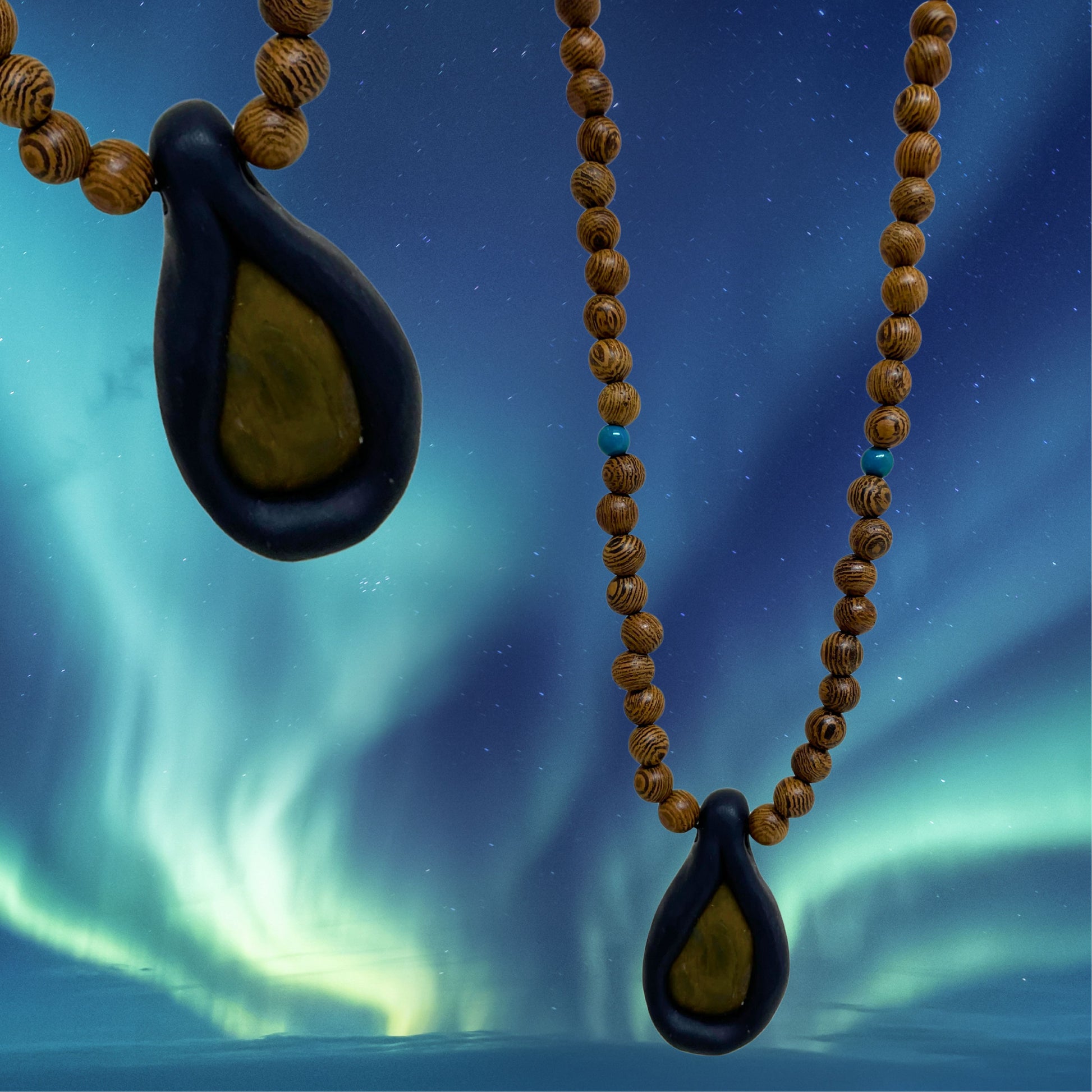 Amuletten hänger i ett justerbart halsband av träkulor och flätad, vaxad bomullstråd — enkel att bära, lätt att anpassa och gjord för att följa dig genom dagen.