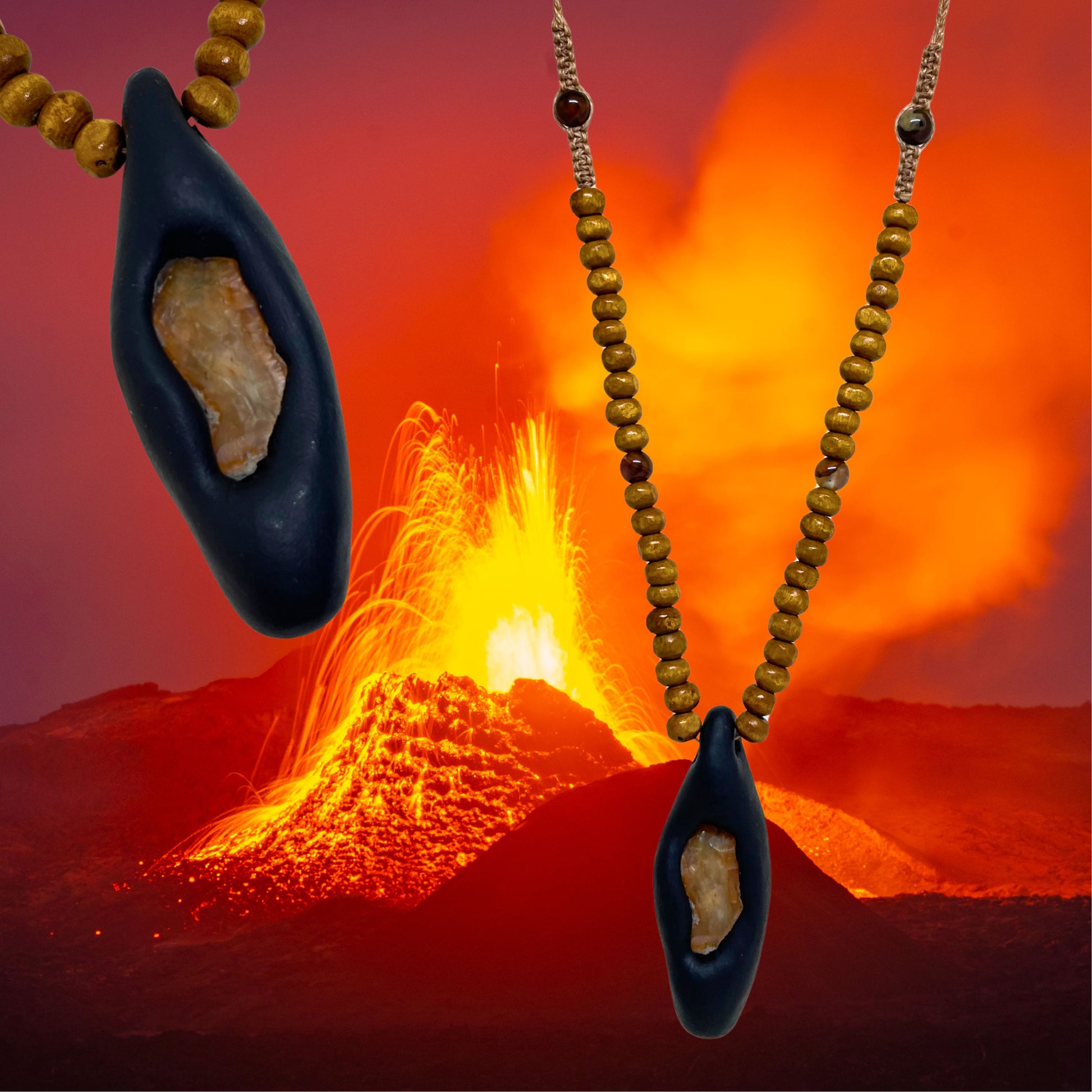Denna handgjorda amulett bär en orangeröd sten med mjuka, naturliga skiftningar som gör varje exemplar unikt. Färgen för tankarna till solvarma klippor, glödande jord och den varma tonen i tidiga solnedgångar.