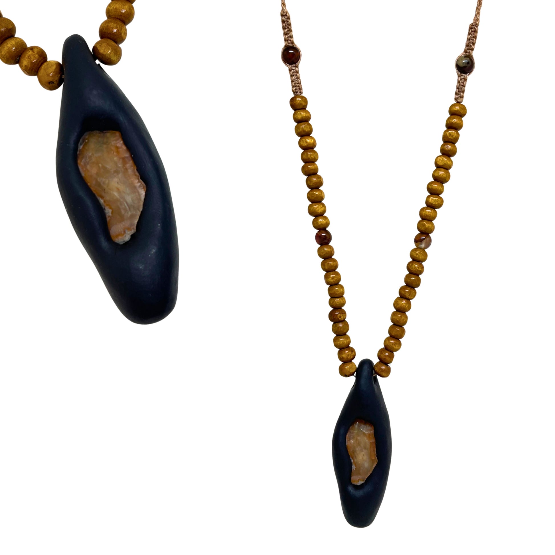 Amuletten hänger i ett justerbart halsband av träkulor och flätad, vaxad bomullstråd — enkel att bära, lätt att anpassa och gjord för att följa dig genom dagens rytm.